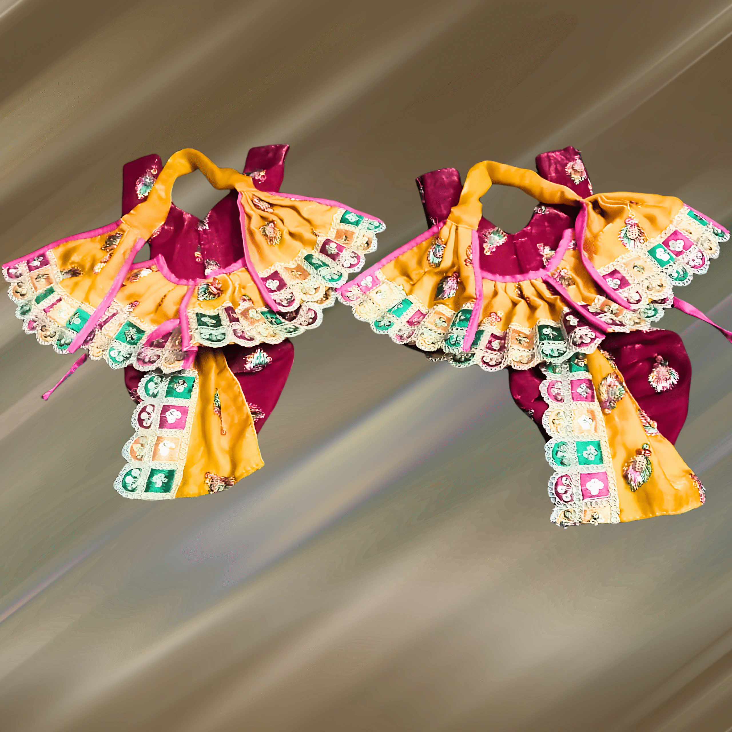 Elegant Gaur Nitai Poshak in rich maroon and mustard yellow satin, decorated with colorful patchwork embroidery, zari borders, and sequins. Lightweight and divine—perfect for daily seva, festivals, or gifting.
